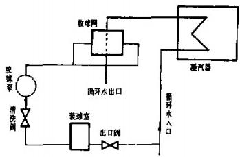 電廠凝汽器膠球清洗系統如圖1所示。密度與水相近的海綿膠球(用天然橡膠或合成樹脂制成)裝人球室后,啟動膠球泵可以將膠球用比循環水壓力高的水流送入凝汽器水室。膠球直徑雖比銅管內徑大1~2mm,但因是多孔柔軟的彈性體,很容易被水流帶入銅管,并被壓縮成卵形。膠球在行進過程中抹去管壁上的污垢,流出管壁時,依靠自身的彈力彈掉表面的污垢,并隨循環水流人收球室,然后被膠球泵重新送人凝汽器。