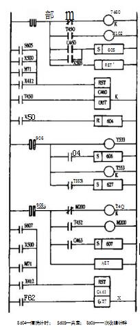 膠球清洗和反洗時間根據現場要求通常為幾十min甚至幾h,F?-60MR的定時器T大計時時間為999s,大約是16.5min。這樣滿足不了現場要求。本控制系統采用了計數器C與定時器T聯合計時的方法,計時范圍為999×999s,解決丁計時時間問題(見圖3)。另外,F?-60MR的定時器可以重復使用,只要正確送入K值即可。