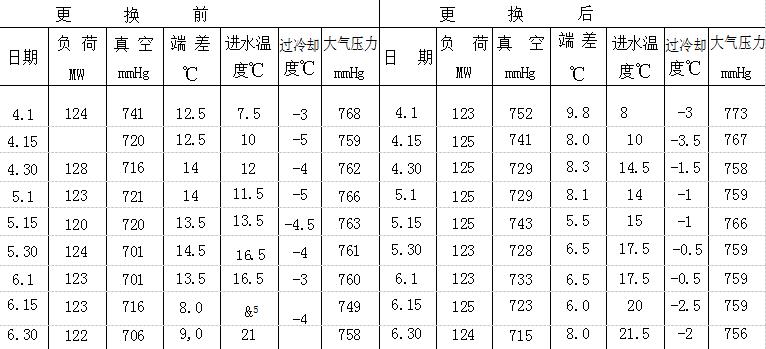 2、每臺機每兩天進(jìn)行一次膠球清洗,每次投入300個膠球,清洗1小時,收球半小時。經(jīng)過兩年的實踐,證明14FH-5-0凈水器和S-14-0收球網(wǎng)操作方便、除污性強、耐海水腐蝕、收球率在95%以上、對凝汽器冷卻管保護(hù)膜沒有損壞、減輕了檢修人員的勞動。凝汽器各項經(jīng)濟(jì)指標(biāo)大有好轉(zhuǎn),經(jīng)濟(jì)效益顯著提高。以1號機為例,更換前、后每月抽出三天,以每天上午9點鐘的運行參數(shù)進(jìn)行同期比較,見附表.