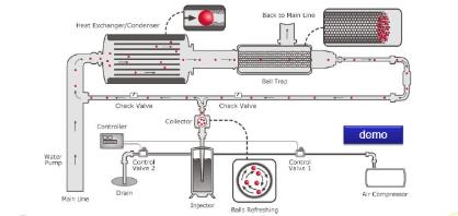 CQM公司的膠球清洗系統(tǒng)的創(chuàng)新設(shè)計確保膠球零逃逸。此為CQM系統(tǒng)的工作原理圖,其中捕球器的創(chuàng)新設(shè)計確保了膠球零逃逸。