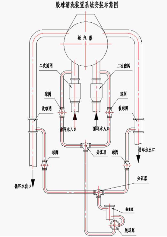 電廠凝汽器膠球清洗系統如圖所示。密度與水相近的海綿膠球(用天然橡膠或合成樹脂制成)裝入球室后,啟動膠球泵可以將膠球用比循環水壓力高的水流送入凝汽器水室。膠球直徑雖比銅管內徑大1~2mm,但因是多孔柔軟的彈性體,很容易被水流帶入銅管,并被壓縮成卵形。膠球在行進過程中抹去管壁上的污垢,流出管壁時,依靠自身的彈力彈掉表面的污垢,并隨循環水流入收球室,然后被膠球泵重新送入凝汽器。