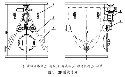 近幾年來,黃埔電廠、漳澤電廠、蘭州第二熱電廠等多家電廠均進行了設(shè)備改造,改造后的設(shè)備運行良好,收球率可達95%以上。改造后的收球網(wǎng)采用SF型,如圖1所示。1收球網(wǎng)本體;2網(wǎng)板;3導(dǎo)流板;4推進機構(gòu);5軸系圖1SF型收球網(wǎng)改造后的設(shè)備結(jié)構(gòu)大大簡化,采用兩個網(wǎng)板,膠球經(jīng)網(wǎng)板一次匯集即可由引出管引出。網(wǎng)板上存在雜物需要清洗時,將網(wǎng)板置反洗位。