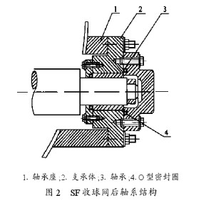 (4)傳動機構(gòu)老產(chǎn)品的各個網(wǎng)板分別由各自的執(zhí)行機構(gòu)控制,在實際運行中容易出現(xiàn)不同步。老產(chǎn)品所用的電動執(zhí)行機構(gòu)自鎖性能也較差,不能控制網(wǎng)板平穩(wěn)準(zhǔn)確轉(zhuǎn)動,在實際運行中時常發(fā)生兩個網(wǎng)板沒有同時與外殼內(nèi)壁貼緊,出現(xiàn)漏球。改造后,收球網(wǎng)兩個網(wǎng)板由同一個執(zhí)行機構(gòu)控制,又采用了大減速比的螺旋執(zhí)行機構(gòu)推進,動作平緩,自鎖性好,解決了網(wǎng)板不同步問題。在設(shè)備運行時,網(wǎng)板受到水流沖擊也不會發(fā)生抖動。1軸承座;2支承體;3軸承;4O型密封圈圖2SF收球網(wǎng)后軸系結(jié)構(gòu):