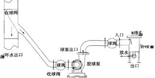 2018年4月20日,利用停窯檢修時間,安裝膠球清洗裝置。安裝工作按下述技術(shù)要求進(jìn)行:安裝前對到貨設(shè)備按技術(shù)參數(shù)要求進(jìn)行驗(yàn)收,特別是收球網(wǎng),確保設(shè)備制造質(zhì)量達(dá)標(biāo)。各管路和彎頭的安裝按圖1進(jìn)行。收球網(wǎng)的出膠球口必須高于膠球泵人口0·5m及以上;各接口有彎頭過渡連接的,彎頭要大于或等于90。,彎徑最好大于2·5倍管徑。
