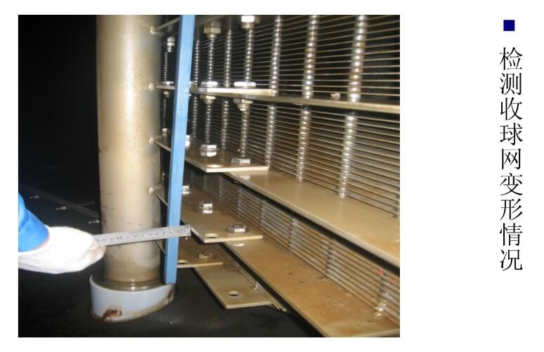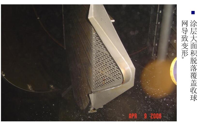 2.收球網(wǎng)變形,凝汽器水室涂層脫落,大面積覆蓋在收球網(wǎng)上,導致收球網(wǎng)變形。