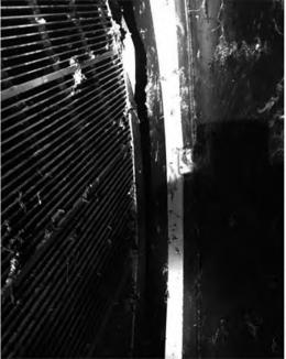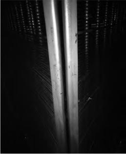 在機組C修中,通過液壓千斤頂對收球網(wǎng)網(wǎng)板進(jìn)行初步固定,同時利用乙炔焰配合大錘敲擊進(jìn)行網(wǎng)板形狀矯正,通過火烤、捶打和液壓裝置固定等矯正手段,使得修后收球網(wǎng)網(wǎng)板的中間間隙均小于2mm,如圖5所示,保證了運行期間膠球不會通過間隙漏至長江。