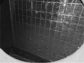 由于長江下游汛期水草雜物多,若循環(huán)水旋轉(zhuǎn)濾網(wǎng)網(wǎng)板間間隙較大會導(dǎo)致雜物覆蓋收球網(wǎng),嚴(yán)重時會導(dǎo)致收球網(wǎng)變形甚至軸承抱死,收球網(wǎng)無法開啟和關(guān)閉到位,從而導(dǎo)致收球率較低。如圖3、4所示,某電廠收球網(wǎng)變形后會導(dǎo)致收球網(wǎng)網(wǎng)板關(guān)閉不嚴(yán),在收球的過程中,膠球不僅會通過收球網(wǎng)網(wǎng)板間的間隙漏出,還會通過收球網(wǎng)與循環(huán)水管壁的間隙漏出,導(dǎo)致收球率較低。